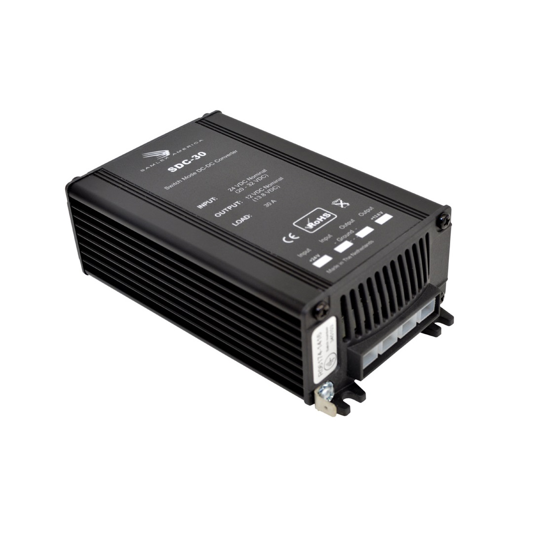 Este convertidor DC-DC reductor de modo de conmutación de alta eficiencia convierte una tensión de entrada de 24 VDC nominal (rango 20 VDC a 32 VDC) a una tensión de salida altamente regulada de 12 VDC nominal (13,8 VDC) a 30 Amps. El convertidor DC-DC SDC-30 no está aislado (no hay aislamiento galvánico entre entrada y salida) y está diseñado para su uso en sistemas de tierra negativos. Las características incluyen protección de sobretensión / cortocircuito, límite de corriente compensado por temperatura, protección de sobrevoltaje de salida, protección contra sobrevoltaje / transitorios de entrada y protección de polaridad inversa de entrada. El convertidor DC-DC SDC-30 está diseñado para aplicaciones de servicio pesado.