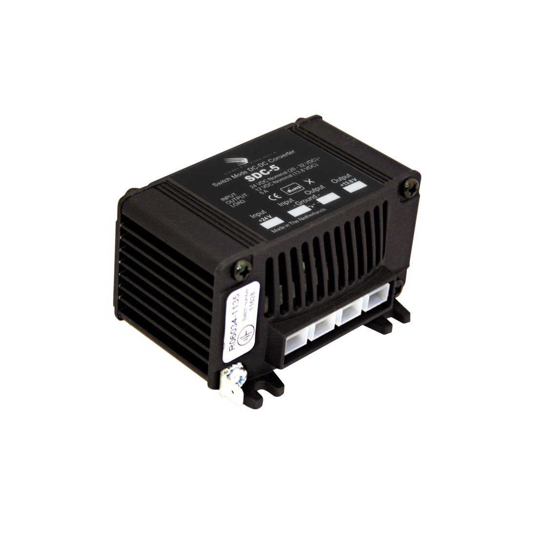 Este convertidor DC-DC de alta eficiencia convierte una tensión de entrada de 24 VCC nominal (rango de 20 VDC a 32 VDC) a una tensión de salida altamente regulada de 12 VDC nominal (13,8 VDC) a 5 Amperios. El convertidor DC-DC SDC-5 no está aislado (no hay aislamiento galvánico entre entrada y salida) y está diseñado para su uso en sistemas de tierra negativos. Las características incluyen protección contra cortocircuito, polaridad inversa y sobretensión